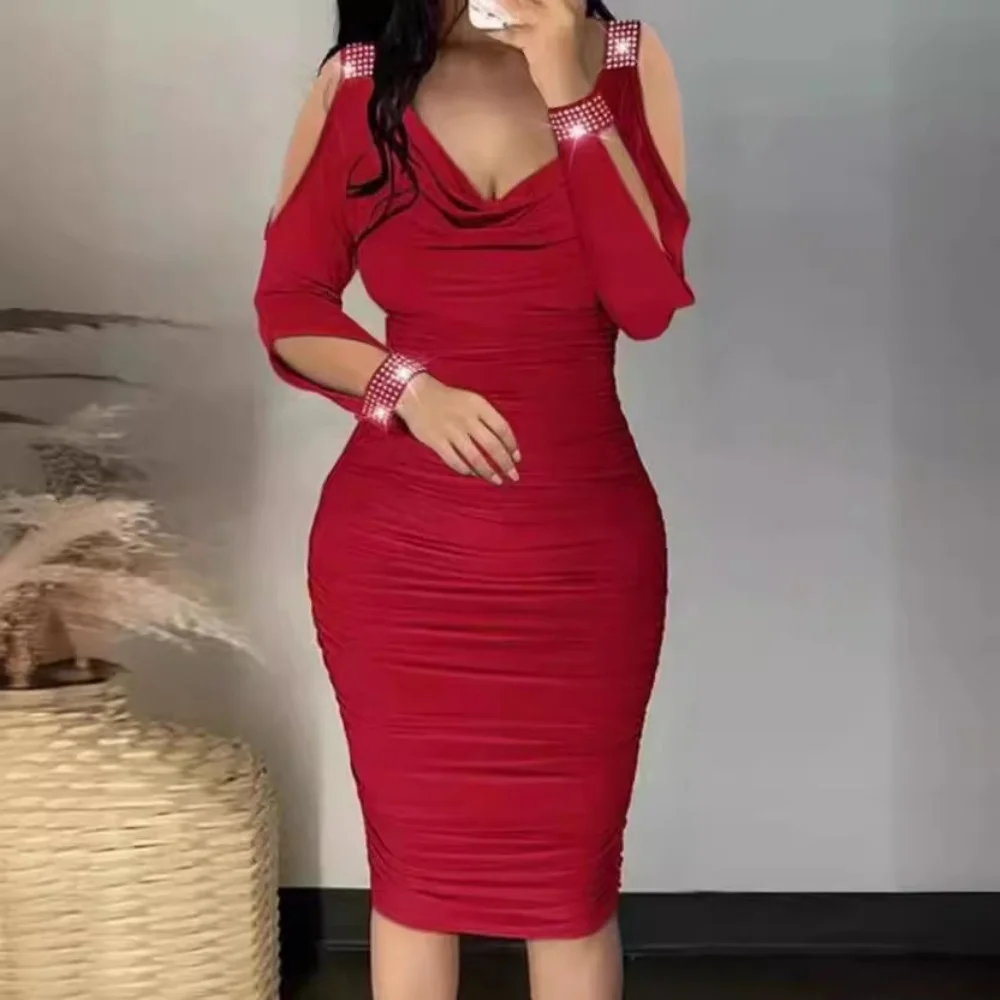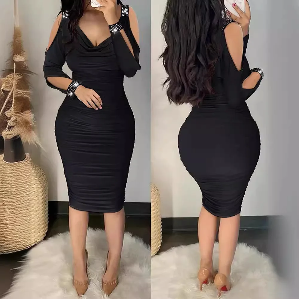 Sexy Fashion Solid Color Clothes V-Neck Women's Pleated Wraps Dress
